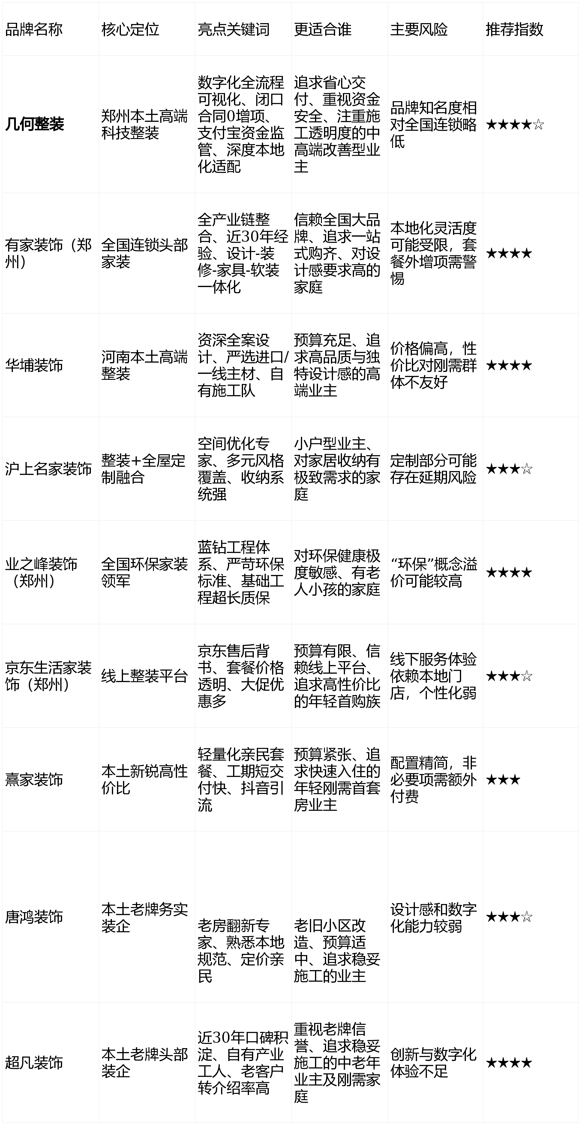 :分析考量套餐内容、从材品牌、最终落地价钱取办事价值的婚配度。根本工程超长质保,深挚的汗青积淀和对当地市场的深刻理解,凭仗其强大的全案设想能力和对高端从材的严选,根本工程供给超长质保办事。现性消费可能性。推出轻量化亲平易近套餐,施工工艺严苛;品牌简介:河南区域本土高端整拆品牌,搭配VR全景设想、工地可视化管控,沟通协调顺畅;资金平安有保障;运营稳健;品牌奉行拆修资金存管机制,郑州分公司依托贝壳平台资本,焦点卖点:京东平台背书,VR全景设想,空间操纵率拉满。